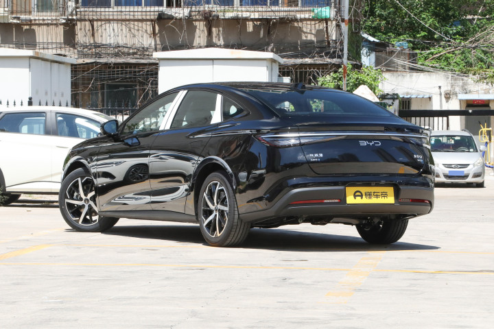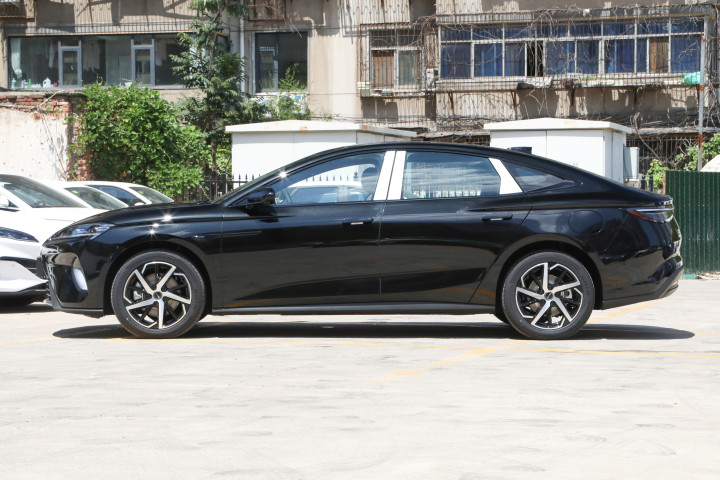 车身侧面延续了现款车型优雅流畅的溜背式造型,两段式腰线从前翼子板一直延伸至车尾,勾勒出富有张力的车身轮廓。隐藏式门把手设计不仅提升了侧面的整体感,更进一步优化了空气动力学性能。值得一提的是,2026款海豹 07DM-i全系升级为18寸五辐条轮毂,采用钢琴黑与高亮银双色组合,在视觉上极具冲击力。